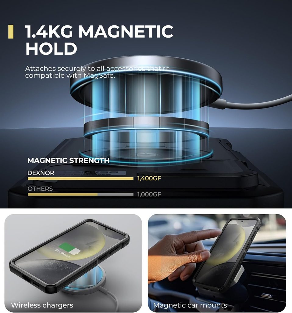 Калъфът от Dexnor осигурява отлично ниво на защита за вашия телефон. Конструкцията е проектирана с двоен слой хибридна защита, която гарантира пълна защита на телефона ви от всички ъгли. Калъфът е устойчив на удари, падания, повреди и надраскване, а освен това е съвместим с технологията MagSafe, което позволява лесно и бързо безжично зареждане без да е необходимо да сваляте калъфа.